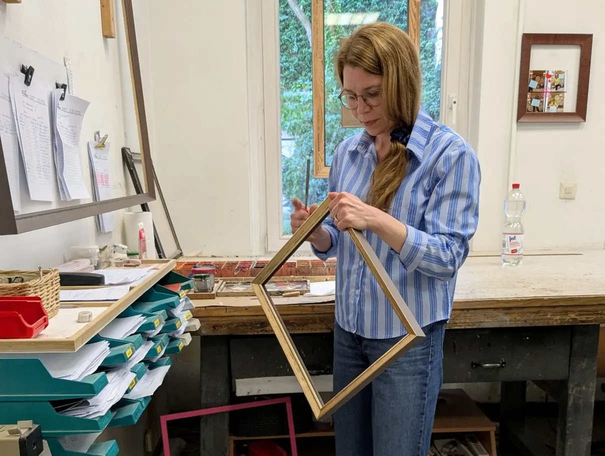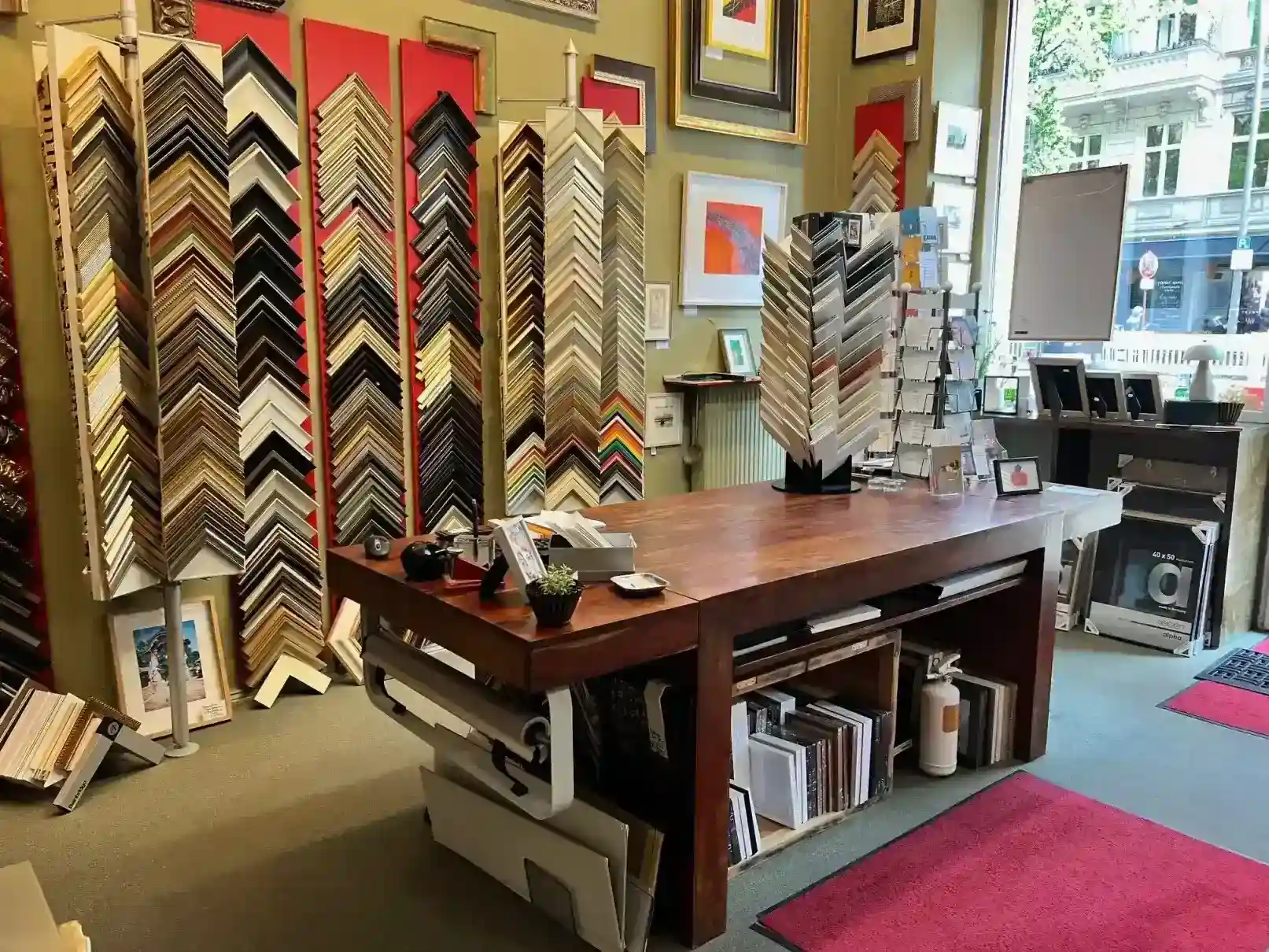 Hinter dem Ladengeschäft befindet sich unsere eigene Rahmenwerkstatt, in der Ihre Bilder von unseren erfahrenen Mitarbeitern auf einer Fläche von rund 150 Quadratmetern täglich angefertigt werden. Unsere langjährige Erfahrung in der Fertigung von Bilderrahmen garantiert Ihnen eine professionelle Umsetzung Ihrer Wünsche und Vorstellungen. Vom Leistenzuschnitt bis hin zur Kaschierung entsteht bei uns alles im eigenen Haus – Qualität aus erster Hand.